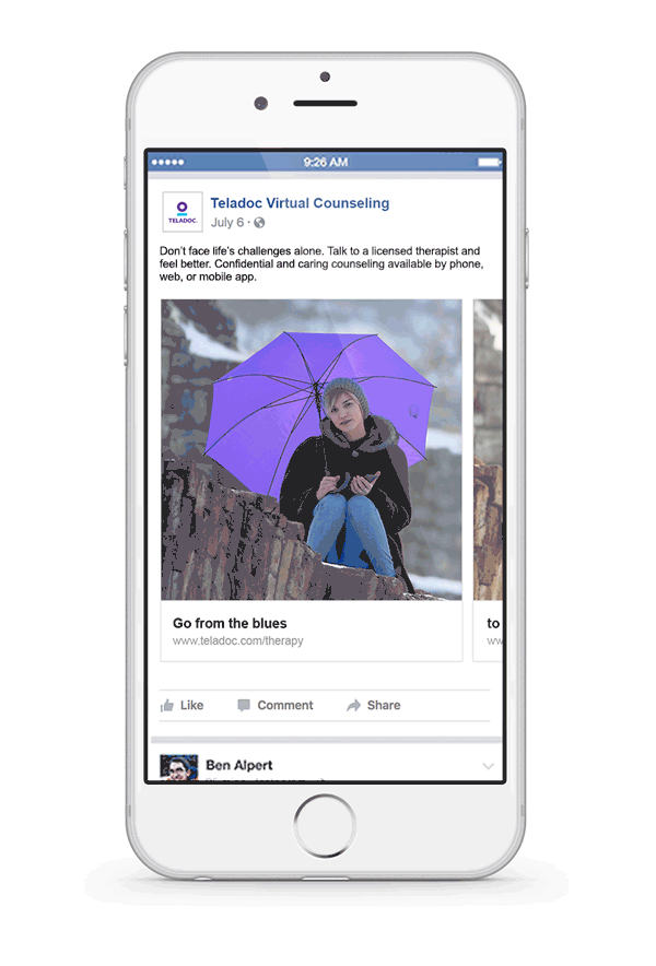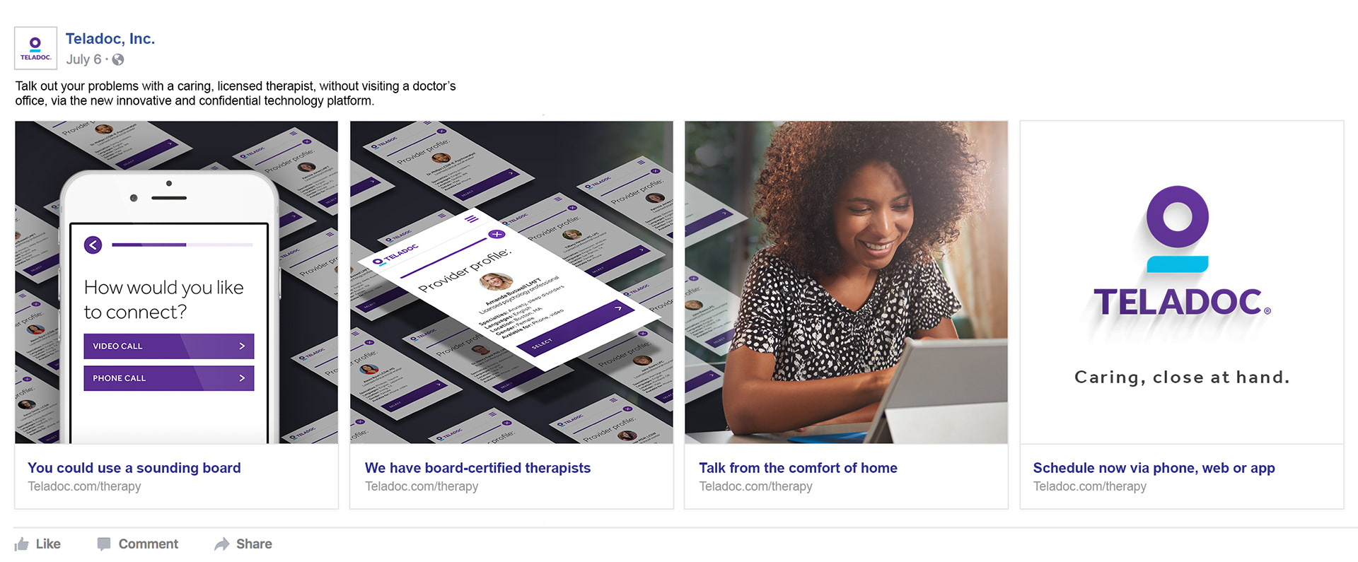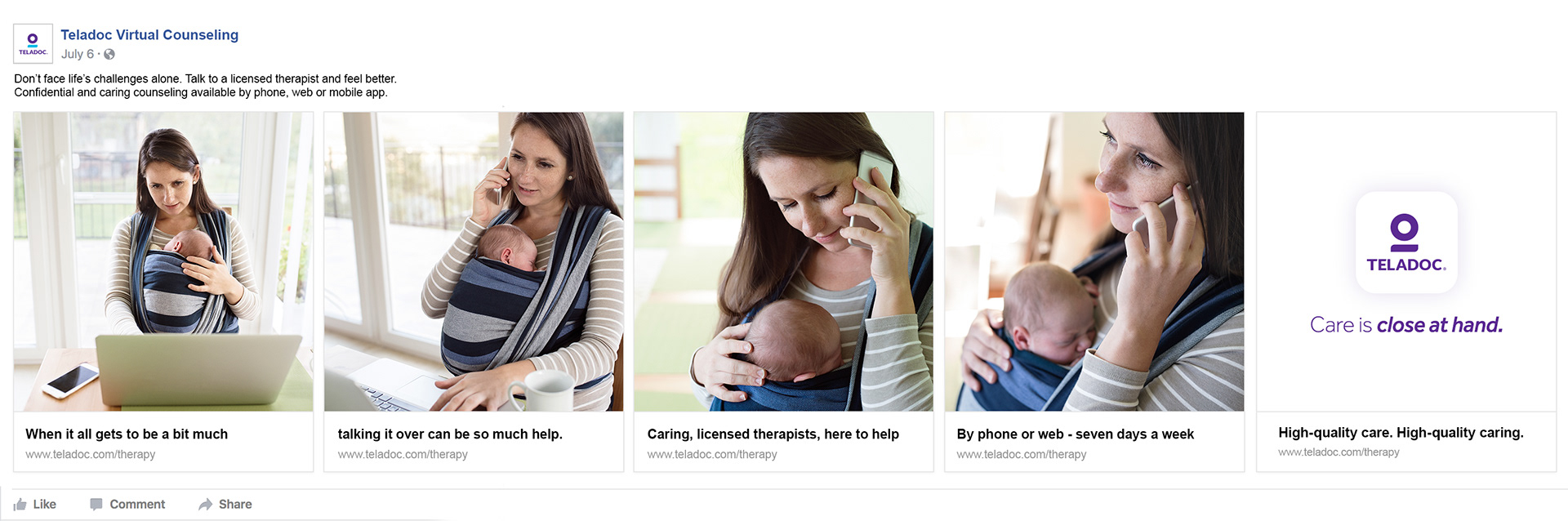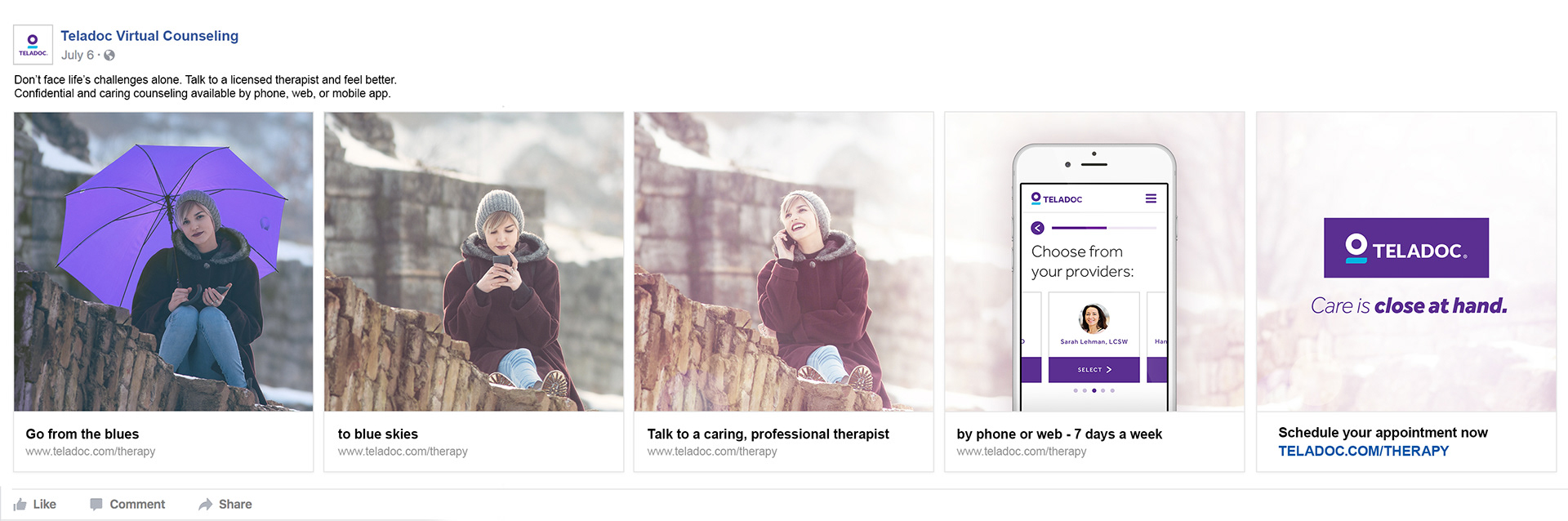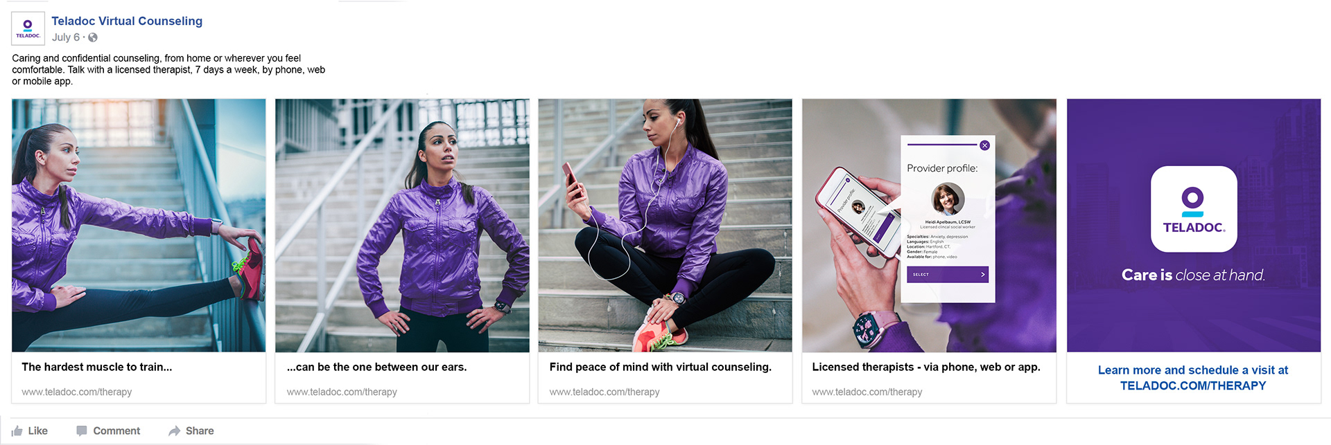 Facebook carousel concepts in the client's unique brand voice to advertise a new virtual counseling product, targeting key demographics.