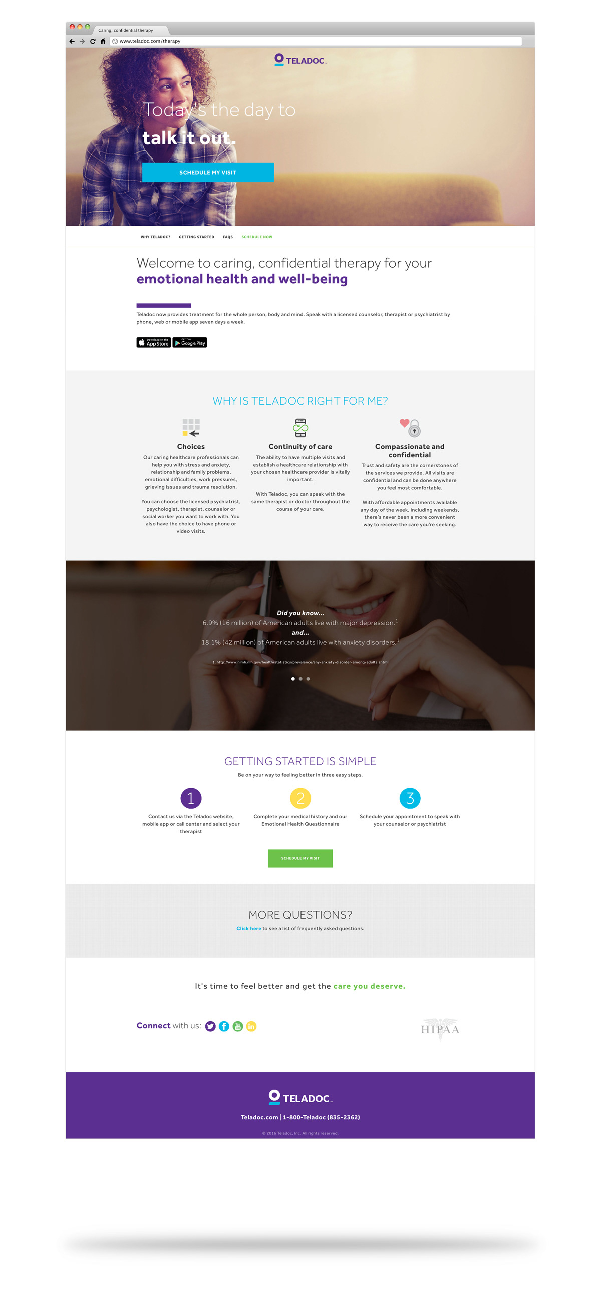 Responsive page designed to introduce Teladoc's new virtual counseling services, explaining the benefits to consumers and calling them to take action and schedule a virtual consultation with a mental health professional.